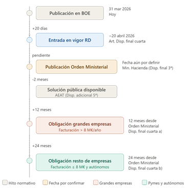 Conviene destacar que, pese a la entrada en vigor formal del Real Decreto, la obligación de facturación electrónica no es todavía exigible. La propia norma prevé expresamente que su aplicación efectiva queda diferida hasta la aprobación de una orden ministerial que desarrolle la solución pública de facturación electrónica. Será esta orden la que determine el momento a partir del cual comenzará el cómputo de los plazos de implantación.